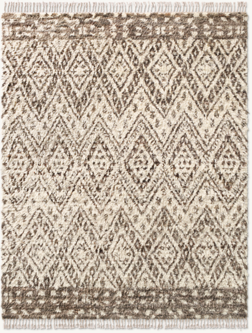 Defined by an intricate sequence of diamond medallions and zigzag lines, Faiza is realized in cut pile to painterly effect. The composition, hand-spun of pure wool, is anchored by a dappled border and braided fringe.