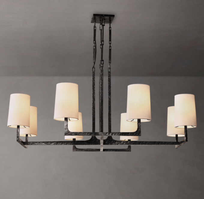 3540 €Member /5060 €RegularSpare and elegantly minimal, our fixture by Ian K. Fowler defines refined simplicity. A hand-forged, hammered metal frame – its arms perfectly tapered – showcases tailored white linen shades. An exercise in balance and proportion, it conjoins light and dark, crisp right angles and understated curves.
