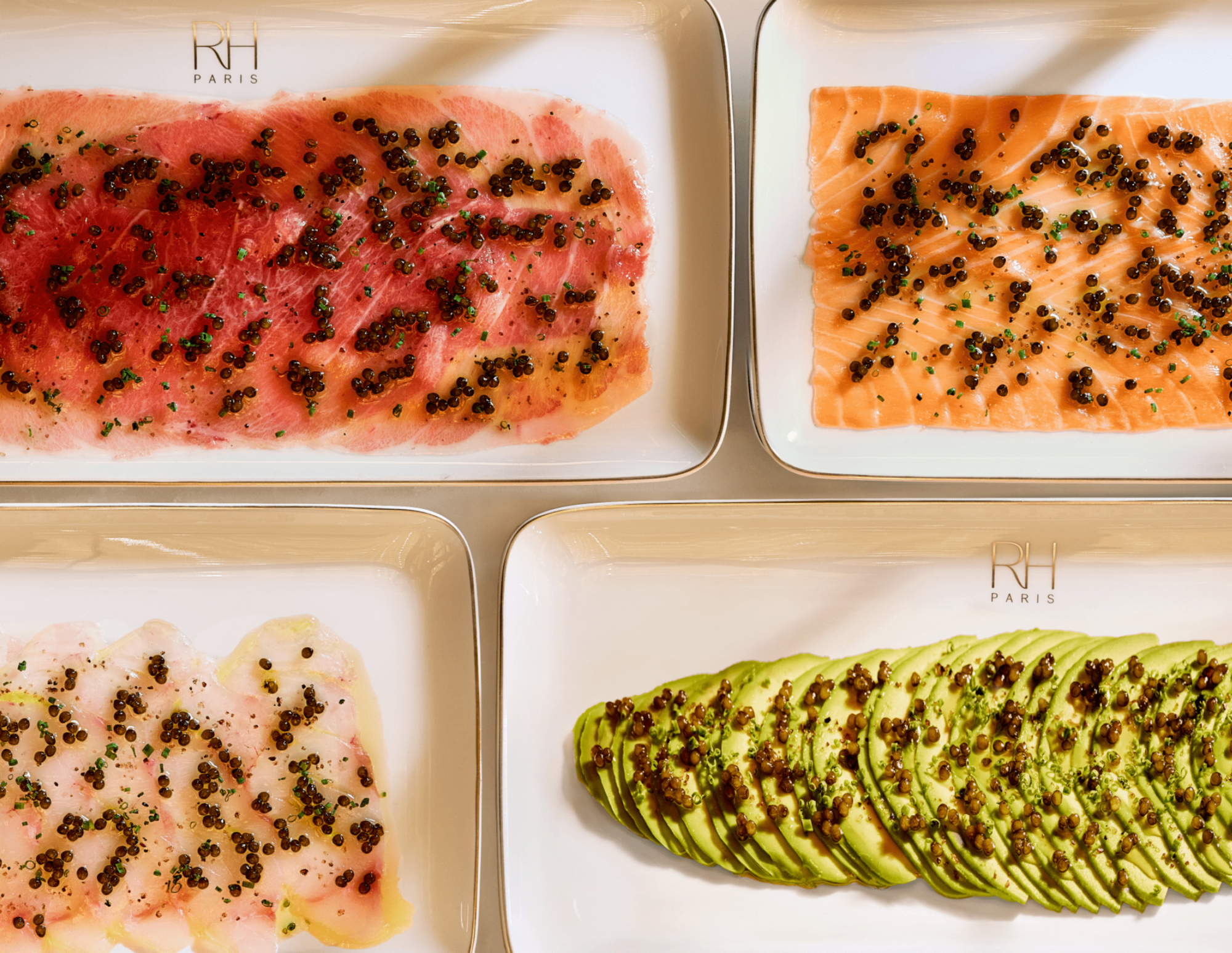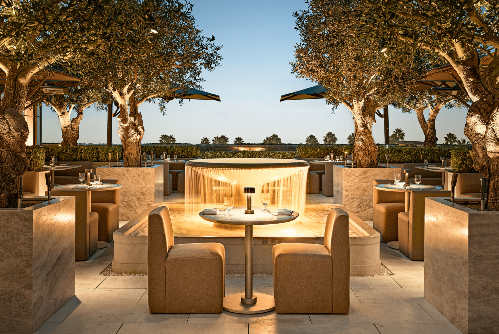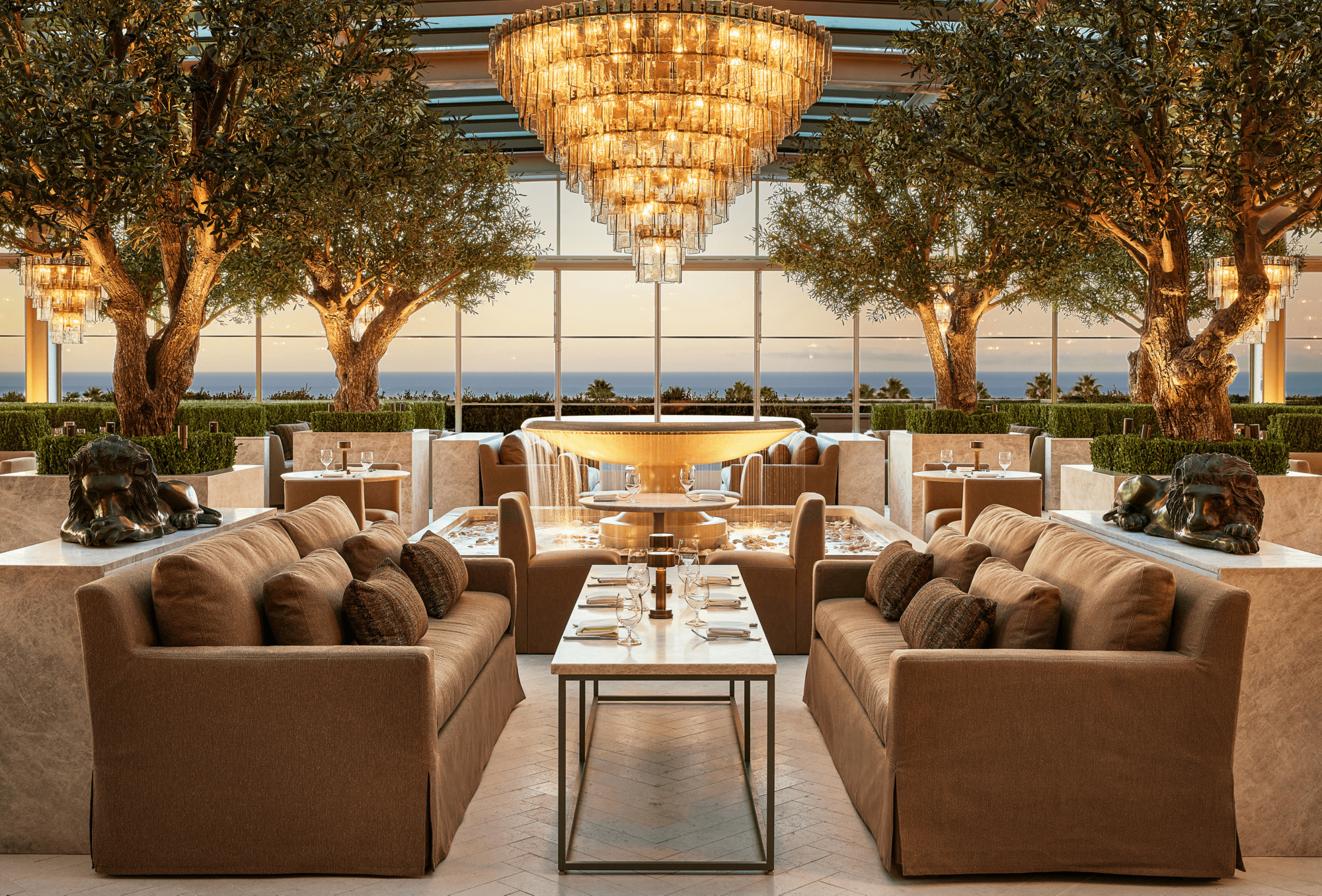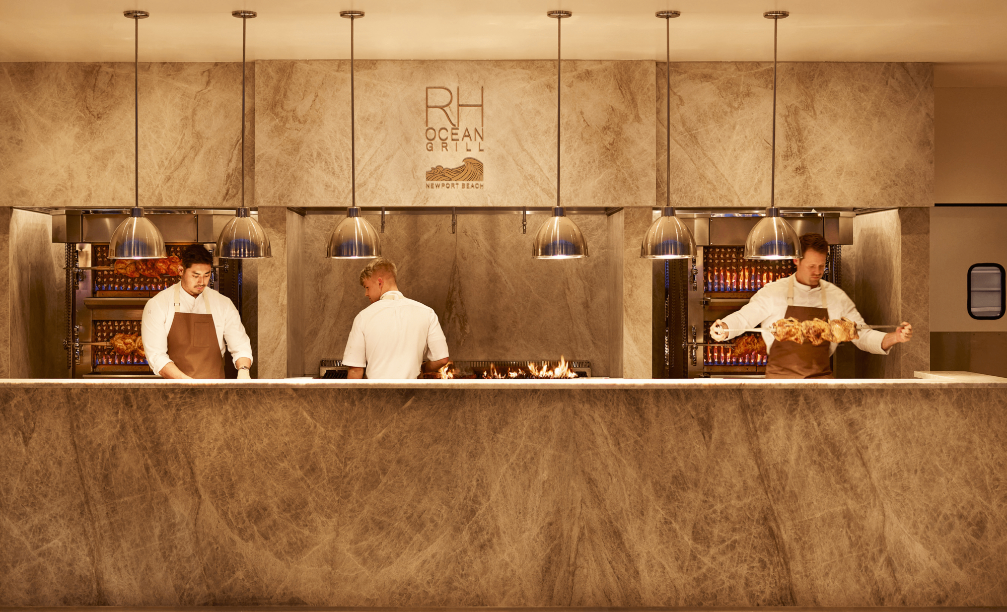 The RH Ocean Grill features a menu of seafood and caviar specialties, along with a selection of signature salads and classics from our hearth. Dine in a year-round skylit garden with heritage olive trees, sparkling chandeliers, a cascading center fountain and panoramic views of the California coastline.
